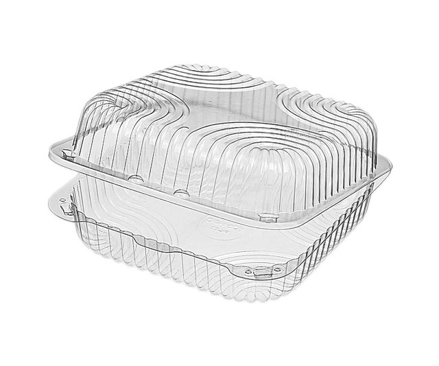Универсальный контейнер-ракушка квадратной формы с неразъемной крышкой предназначен для фасовки различных кондитерских изделий: пирожных, нарезных пирогов, десерта, блюд фаст-фуда и полуфабрикатов.