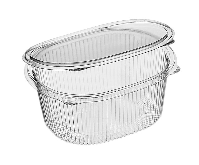 Пластиковый одноразовый контейнер-ракушка овальной формы предназначен для фасовки салатов, десертов, овощей, солений, холодных закусок и полуфабрикатов с объёмом до 1000 мл.